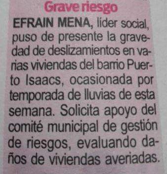 Las viviendas de Puerto Isaacs son, en su mayoría de madera, esterilla y láminas de zinc. El 14 la preocupación de la comunidad pasó a alarma: una vivienda se vino al suelo y 12 más quedaron afectadas. Solicitaron el apoyo del Comité de Municipal de Gestión de Riesgos, incluso a través del diario local Extra, y hasta ahora sólo recibieron una visita y recolección de datos.